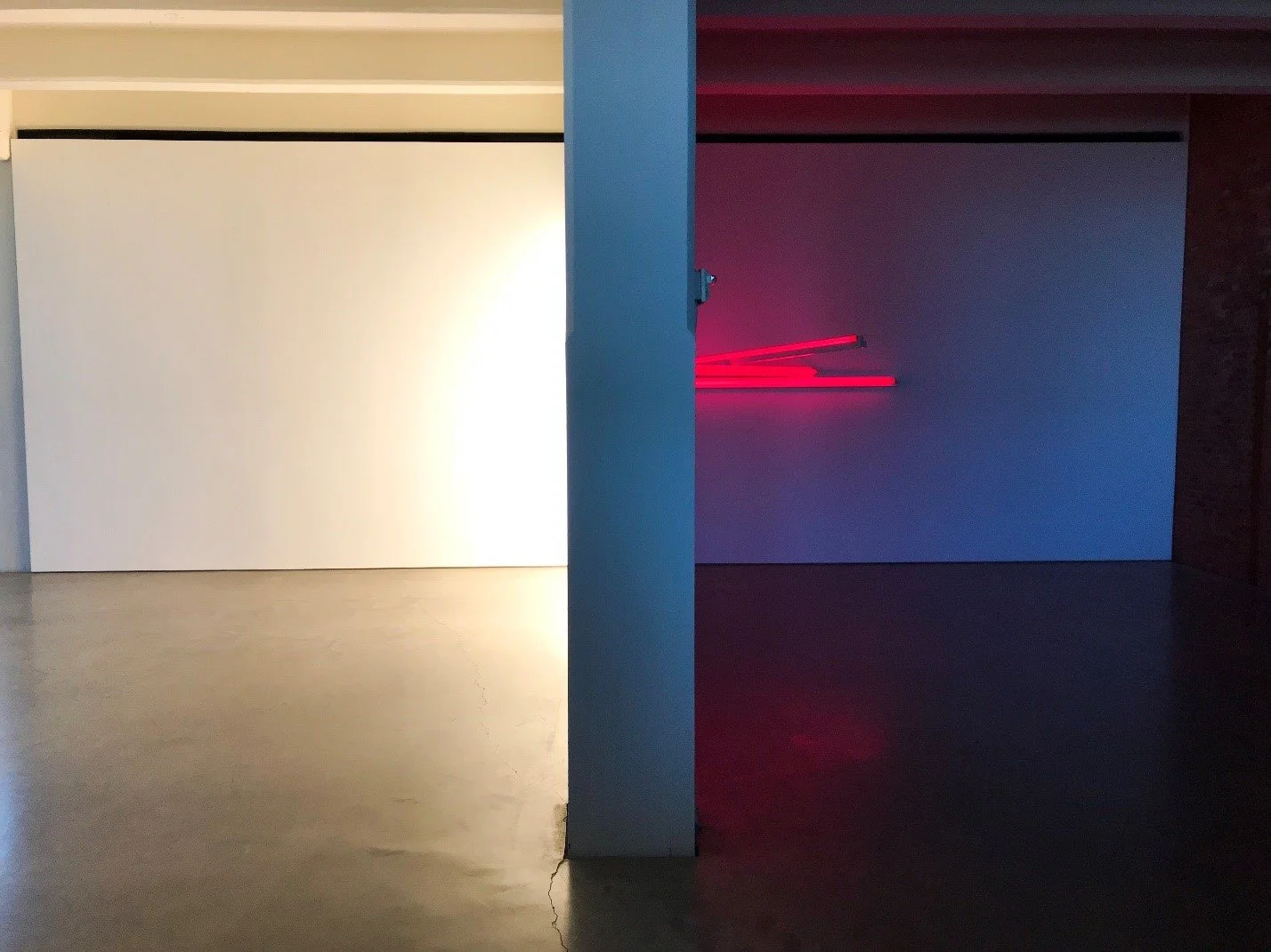 (Left) Dan Flavin’s “Untitled (To a man, George McGovern) & (right) “Monument 4 for those who have been killed in ambush” showing the juxtaposition of light and dark spaces in an exhibit separated by a hall wall.