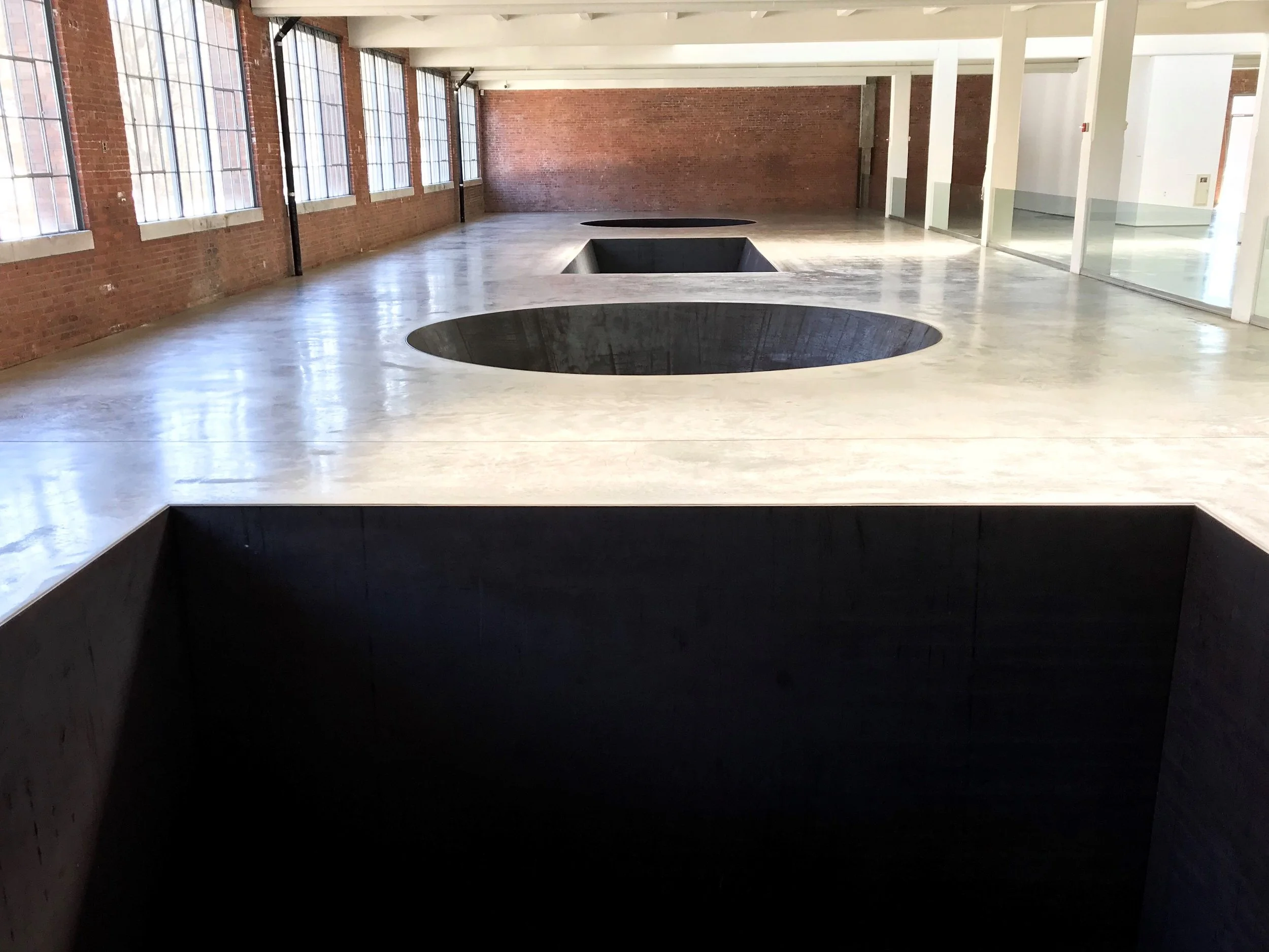 Michael Heizer’s “Negative Megalith” in a room lit by clerestory windows and polished concrete floors.