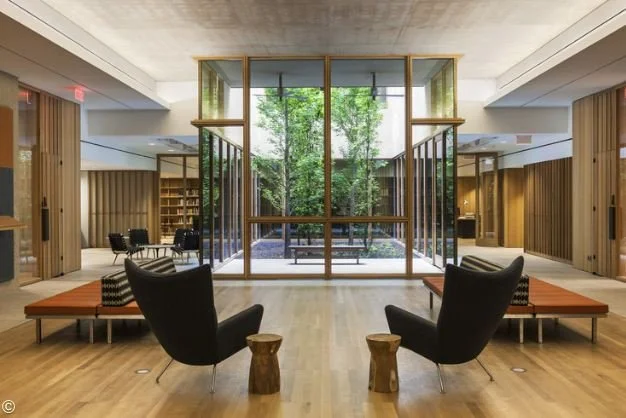 The surrounding landscape of the building closes off the museum from the rest of the city with its many trees and reflective pools. From the lower level you can enter a garden in the center of the gallery that is visible from glass windows on other floors, providing a serene experience when walking from room to room.