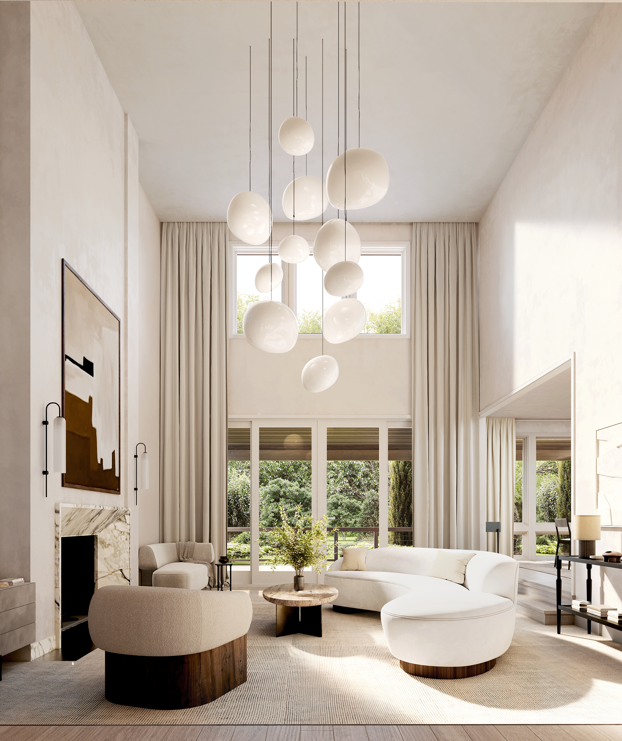 Rooted in the principles of the Japandi style, this new-build residence in Alpine, New Jersey, pairs the restraint of Japanese design with the organic warmth of Scandinavian interiors. Double-height plaster walls, soft neutrals, and natural wood tones establish a calm foundation throughout. Floor-to-ceiling windows frame the surrounding tree canopy, making the landscape a part of every room. The living room centers on a sculptural globe chandelier above a curved ivory sofa and marble fireplace, while the kitchen pairs oak cabinetry with marble backsplash with refined detailing.